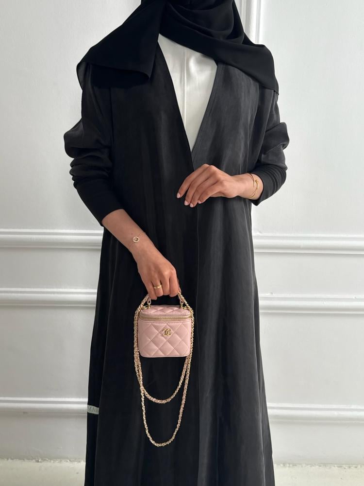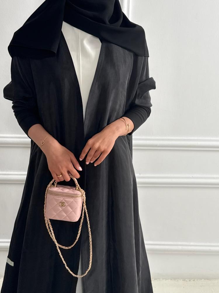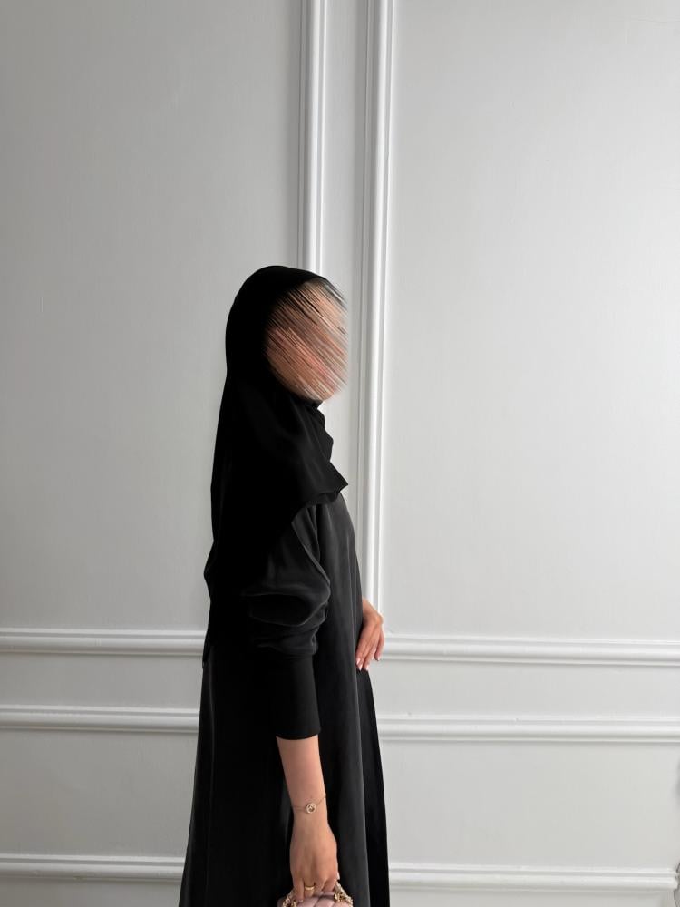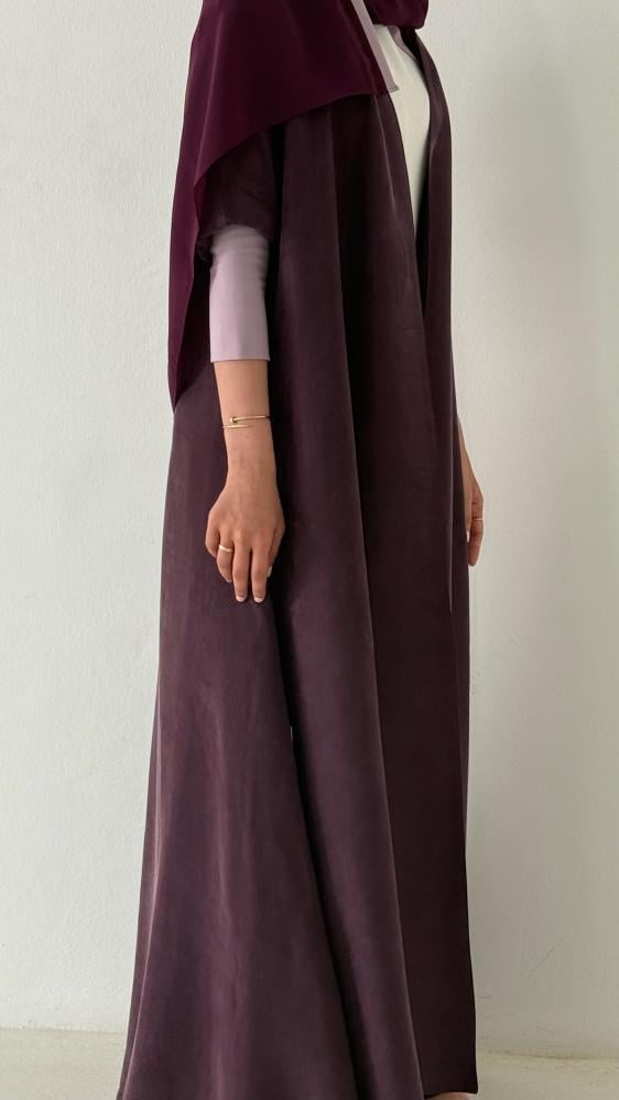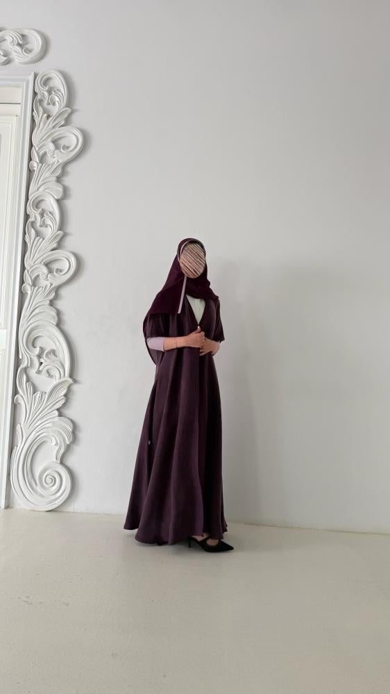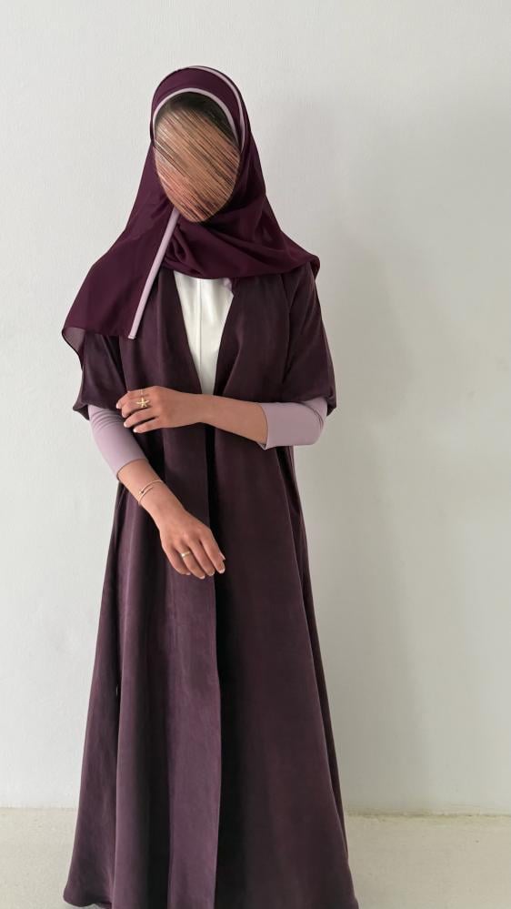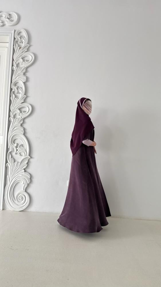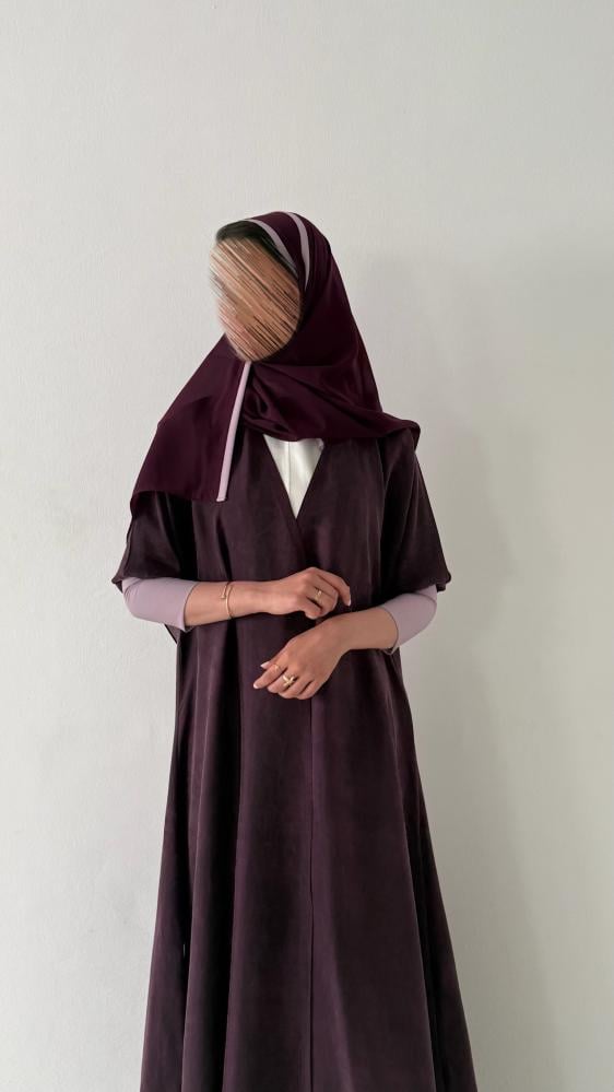 عباية نص كلوش بقماش حرير مغسول تركي بنفسجي ساده مع أكمام كريب استرتش بلون اللافندر شامل طرحة شيفون بنفسجي باطراف